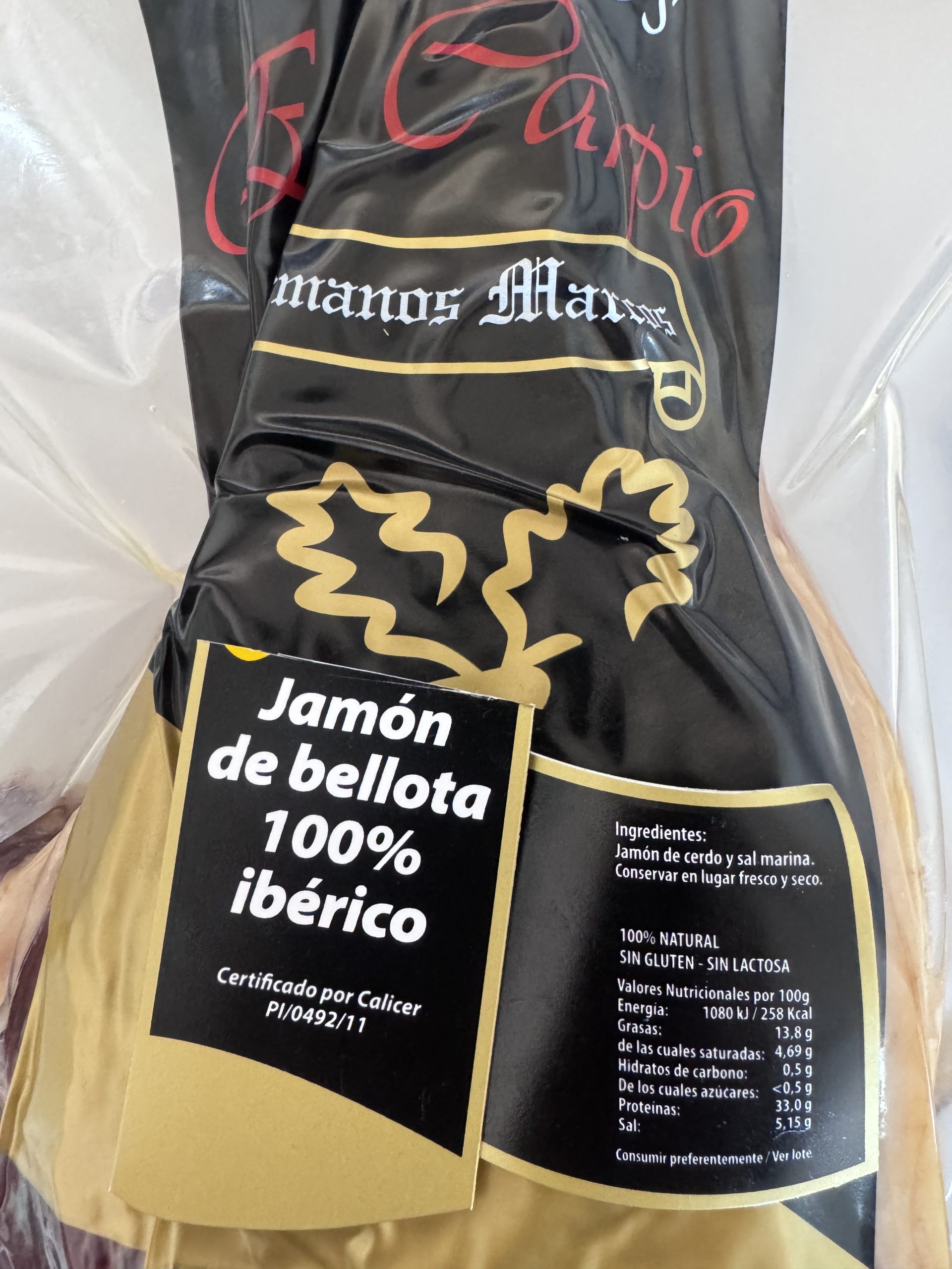 Jamón de cerdo de raza ibérica criado en libertad en dehesas, alimentado con pastos y bellotas en montanera. Periodo en el que los principales ácidos oleicos de las bellotas se infiltran en las carnes de esta especie transfiriendo al jamón unos aromas y sabores exquisitos. Producto natural sin aditivos artificiales. No contiene gluten.