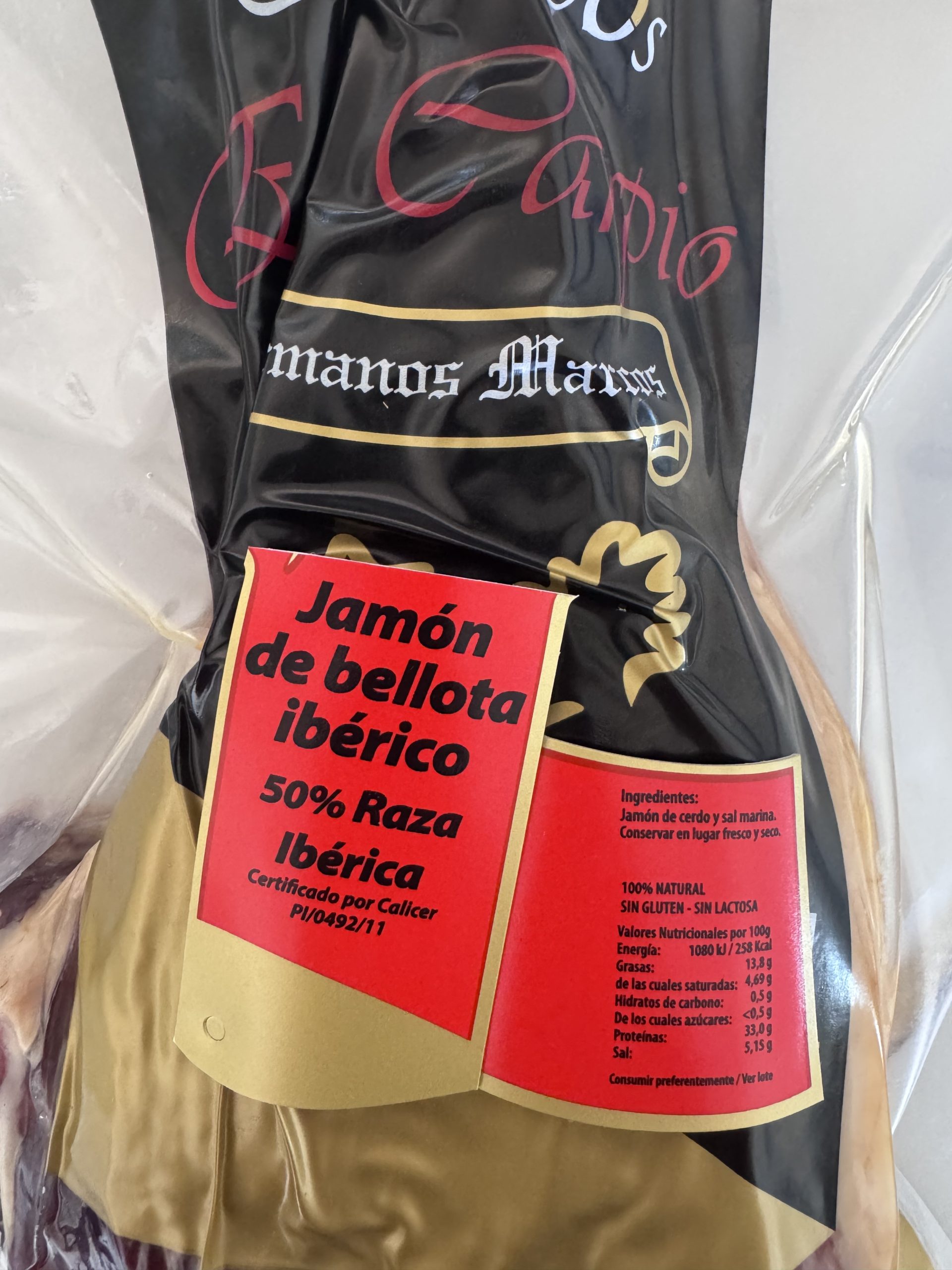 Jamón de cerdo de raza ibérica criado en libertad en dehesas, alimentado con pastos y bellotas en montanera. Periodo en el que los principales ácidos oleicos de las bellotas se infiltran en las carnes de esta especie transfiriendo al jamón unos aromas y sabores exquisitos. Producto natural sin aditivos artificiales. No contiene gluten.