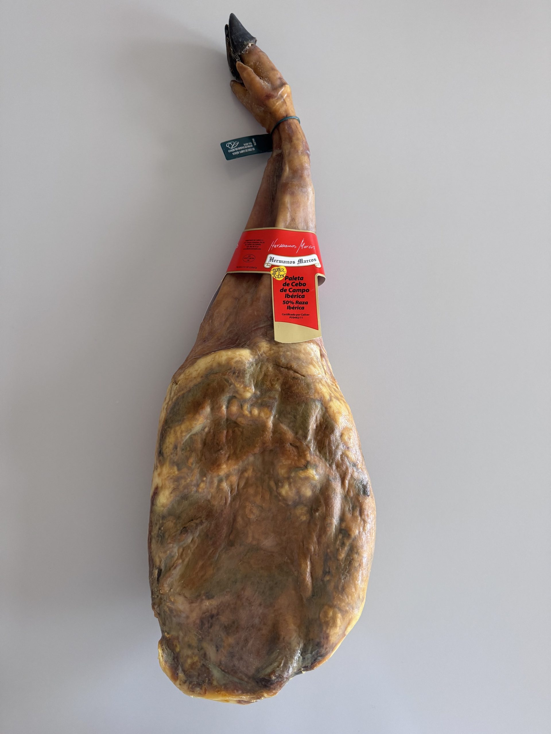 Ingredientes: Paleta de cebo de campo ibérica 50% raza ibérica y sal marina. Las piezas tienen una curación mínima de 24 meses. Piezas de 5kg aproximadamente.