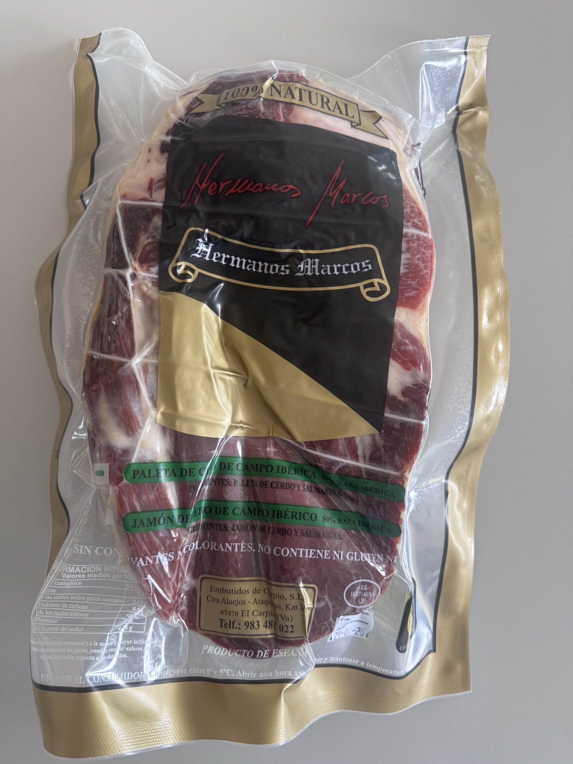 Ingredientes: Paleta de cebo de campo ibérica 50% raza ibérica y sal marina. Las piezas tienen una curación mínima de 24 meses. Piezas de 2,5kg aproximadamente.
